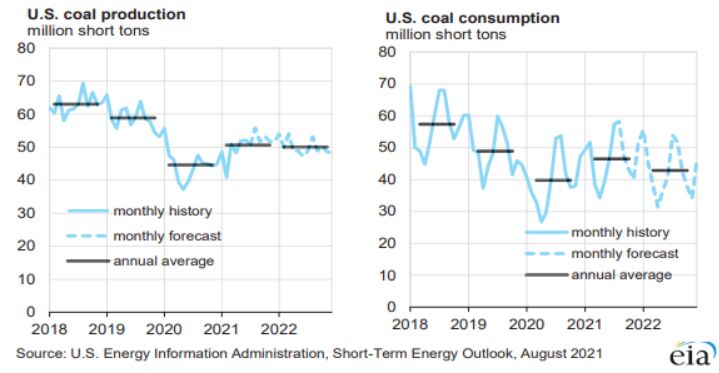 8月10日,美國能源信息署(EIA)發布最新《短期能源展望》報告顯示,2021年,美國煤炭產量預計為6.07億短噸(5.5億噸),同比增長13%,較前一月預期值減少1000萬短噸。 報告顯示,2022年,美國煤炭產量預計為6億短噸,較2021年預期值下降1.15%。