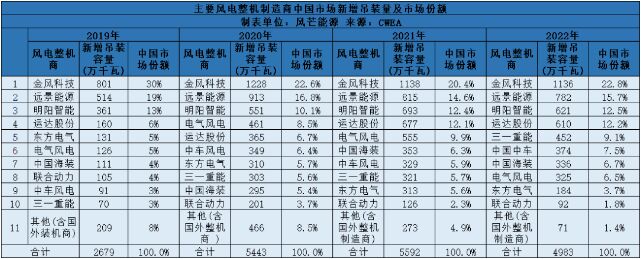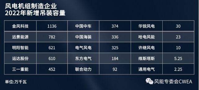 2022年,中國新增吊裝容量前五的風電機組制造企業是金風科技、遠景能源、明陽智能、運達股份、三一重能,其新增裝機容量分別為1136萬千瓦、782萬千瓦、621萬千瓦、610萬千瓦、452萬千瓦。