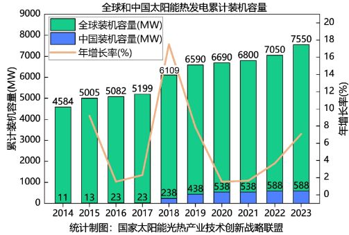 隨著我國新型能源體系、新型電力系統加快建設,兼具調峰電源和儲能雙重功能的太陽能熱發電行業迎來了新發展機遇。1月18日發布的《中國太陽能熱發電行業藍皮書2023》(以下簡稱《藍皮書》)顯示,截至2023年底,我國兆瓦級規模以上光熱發電機組累計裝機容量588MW(兆瓦),在全球太陽能熱發電累計裝機容量中占比7.8%。