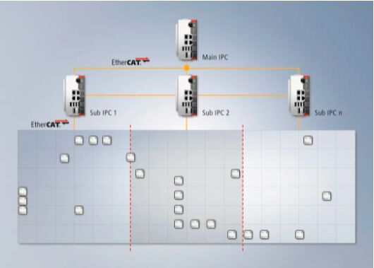 使用 XPlanar 并行計算功能可以將整個系統分為多個子系統,每個子系統由一臺子工業 PC 控制,以實現規模超大的 XPlanar 模塊化系統。這樣就能夠將計算密集型任務最優分配給相應的系統部分。子工業 PC 間的通信確保兩個子系統之間動子的高動態切換,而上位主工業 PC 則用于控制整個系統的運行。作為中央控制器,它還負責應用程序的編寫以及系統的診斷,換句話說,常用的 TwinCAT 3 XPlanar(TF5890)功能都可以在其上運行。此外,既不需要從應用程序訪問下一級的子工業 PC,也不需要在分段切換時轉移動子,使得應用程序的創建和系統操作與以前一樣簡單。