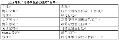 其中,海爾膠州空調綠色低碳工廠實踐、美的綠電行動、加西貝拉高效變頻壓縮機綠色工廠、海爾冰箱綠色智造園區、博西家電可持續發展行動、GMCC美芝綠色工廠、錢江制冷壓縮機現代化智能工廠獲得“可持續發展優創獎”。12款產品或解決方案獲得“低碳先鋒產品獎”。
