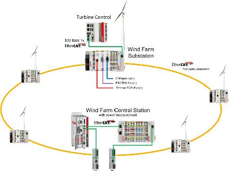 b) 風場的動態無功支撐能力 總裝機容量在百萬千瓦級規模及以上的風電群,當電力系統發生三相短路故障引起電壓跌落時,每個風電場在低電壓穿越過程中應具有以下動態無功支撐能力:當風電場并網點電壓處于標稱電壓的20%~90%區間內時,風電場應能夠通過注入無功電流支撐電壓恢復,所需的無功電流取決于電壓跌落的深度且必須取決于風力發電機組或電網并網點的要求;子并網點電壓跌落出現的時刻起,動態無功電流控制的響應時間不大于75ms,持續時間應不小于550ms。 1.2 現有風電場網絡存在的問題 現有風電場網絡存在的不足主要有兩個:①控制周期慢;②無法協調整個風電場內的風機達到風場級別LVRT功能。 現有的風電場網絡是基于以太網的解決方案,通訊采用以太網光纖,風機處使用普通以太網交換機,風場集控系統與各個風機之間采用TCP/IP等非實時的通訊協議。由于交換機的延時和以太網報文的不確定性,使得整個風電場控制網絡是“秒級”或者更長的時間,通訊速度和通訊的實時性無法保證。 現有風機的LVRT檢測和實現都是在風機本身的變流器部分實現,根據要求新增的風力發電機組都必須具備低電壓穿越能力。然而,考慮到風場規模的增大,以及每臺風機的不同情況,根據單個風機監測的電壓情況作出的反應也許不能產生電網營運商預期的效果。由于風力發電機組與電網并網點之間存在的阻抗,所以它們之間的電壓會有差異。也就是說各個風力發電機組對公共并網點電壓的變化會做出不同的反應。同樣,風力發電機組級饋入的無功電流與電網并網點的最終無功電流也是不一致的。即無法達到國家標準對整個風電場整體的低電壓穿越的要求。 1.3 EtherCAT風場控制網絡解決方案 永磁直驅風力發電機和雙饋異步風力發電機是目前使用最多的風力發電機類型,與傳統的恒速恒頻風力發電機相比,和功率因數可在+0.95到-0.95之間調整,可以在一定的范圍內調整輸出的有功和無功功率,其無功調節能力也廣泛地應用于風電場的無功調整。充分發揮風力發電機自身的無功支撐能力,并以遠端并網點母線電壓為控制目標,對維持電網的無功功率平衡和電壓穩定有著十分重要的意義。來自德國弗勞恩霍夫風能及能源系統技術研究院的Melanie Hau 和Martin Shan [2]的研究表明,風場監控網絡的速度以及風電機組自動控制系統現場總線的速度對風場電壓或無功功率控制可實現的動態性產生了顯著影響。 而這恰恰就是 EtherCAT 風場控制網絡解決方案的優點。迄今為止,風場網絡監控都是使用以太網實現的。以太網光纜用于將單獨的風力發電機組連接到主計算機。因為 EtherCAT 基于以太網,所以其與以太網的物理層完全兼容。當使用EtherCAT時,也可應用相同的物理層。此外,EtherCAT 還完全實現了線纜冗余。風場中的光纜環網通過風場主機的第二塊網卡形成閉環。亮點就在于,與目前使用的支持冗余的交換機相比,使用EtherCAT可以顯著提高傳輸速度并降低成本。 與目前的其它方案不同,EtherCAT 解決方案可以利用EtherCAT使整個風場應對低電壓穿越(LVRT)。因此,如果在風電場并網點診斷出有電壓跌落,它可以在1 ms的時間內將信號傳輸給整個風場的所有風力發電機組。且其能夠讓整個風場對電網中的電壓跌落做出協同的反應。這樣,解決方案即可實現整個風場在電網并網點的確定的行為。 另外,EtherCAT從站中的分布式時鐘能夠確保整個網絡中的數據采樣在時間上保持同步。時基誤差小于1μs(微秒),甚至小于100 納秒。有了這些數據,電流、電壓和頻率可以得到相應控制且電網可以得到最優的支持。 2.倍福極速風電場監控網絡 倍福極速風電場監控網絡方案如下圖2所示。 該方案是基于倍福的工業PC、電力測量端子模塊、帶光纖接口的EtherCAT耦合器和實時的EtherCAT通訊技術、超采樣技術、EtherCAT分布式時鐘技術。倍福工業PC上運行專用的風電場能量管理平臺,具有強大的風電場實時電力監控功能。該平臺提供與電網調度接口,集中實時控制風電場并網點的電壓、功率等等。保證風電場與接入地區電網相互協調運行,實現高效的風電場運行和管理。EtheCAT光電轉換耦合器模塊把風電場管理平臺與風電場內的風機連接到一起,組成風電場實時電力監控網絡,可在風電場網絡中實現小于 1 ms 的實時控制任務。專用的電力監測端子模塊監控風場電網并網點和單臺風機并網側的電網狀況(電壓、頻率、有功、無功等等)。