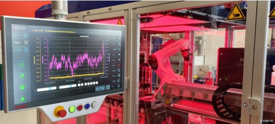 壓印是傳感器隔離膜片生產過程中一個不可或缺的的中間加工步驟,凱樂公司項目經理 Florian Wernli 解釋道:“我們的大部分壓力傳感器都封裝在充油不銹鋼外殼中。隔離膜片對于通過油將周圍介質的壓力傳輸至傳感器內的測量芯片中來說至關重要!边@就需要通過一臺性能強大的自動壓印機將隔離膜片壓印成特殊的形狀。凱樂公司開發與生產裝備部 Bruno Thalmann 補充道:“在經過泄漏檢測、用壓縮空氣清潔和熱平衡處理后,我們在同一工藝步驟中使用氫傳感器在高壓條件下進行壓印并進行確定性泄漏試驗。隨后使用圖像處理和人工智能進行誤差檢測!眽河C的核心部分是一臺 KUKA 機器人,它用作拾放單元,將坯件送至加工位置,并將已完成的工件分成合格品(OK)和不合格品(NOK)兩個部分。