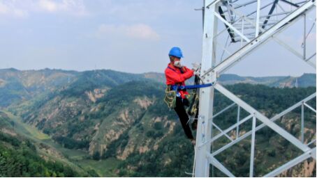 9月6日,延安市延川縣賈家坪鎮曲溪交村330千伏輸變電工程鐵塔組立現場,起重機將組裝好的橫擔緩緩吊起,2分鐘后精準吊放至安裝位置,54米的高空中3名電力工人將塔材對準安裝孔位,迅速開始緊固作業......這是國網延安供電公司以提速電網建設推動延安電網提檔升級的又一“縮影”。
