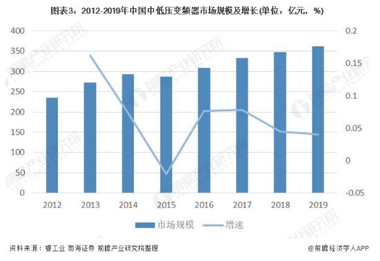 圖表3:2012-2019年中國中低壓變頻器市場規模及增長(單位:億元,%)