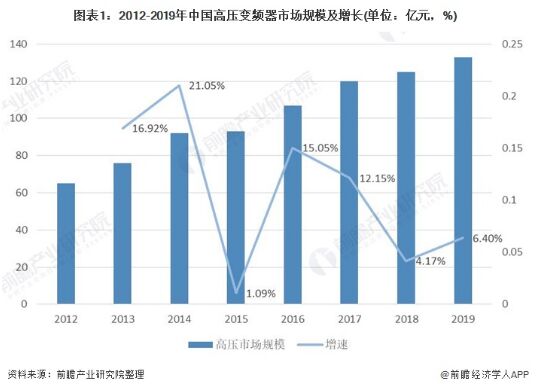 高壓變壓器主要應用領域涉及電力,礦業,水泥,水泥、冶金、石化等行業,可實現對各類高壓電動機驅動的風機、水泵、空氣壓縮機、提升機、皮帶機等負載的軟啟動、智能控制和調速節能,從而有效提高工業企業的能源利用效率、工藝控制及自動化水平。其中通用高壓變頻器主要是通過調節電機轉速實現節能目的,主要應用于電力、礦業、冶金、水泥等領域的風機、泵類傳動控制。我國高壓變頻器市場一直保持著較高的增長率。2012-2019年,高壓變頻器市場規模持續增長,增速呈波動趨勢。