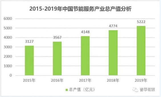 近年來,節能服務產業總產值不斷增長,呈逐年.上漲趨勢。中國節能協會數據顯示,2019 年我國節能服務產業總產值達5,222億元,同比增長9.38%。節能服務從業隊伍不斷發展壯大,截至2019年底,全國從事節能服務產業的企業總數達6,547家,比“十二五”末期增長20.66%,行業從業人數達76.10萬人,比“十二五”末期增長25.37%。最近三年節能服務產值增速較過去增長勢頭雖有所減緩,但仍保持近15%的快速增長,節能服務產業依然是拉動國民經濟增長的積極因素,也發揮著戰略性新興產業的支柱作用。.
